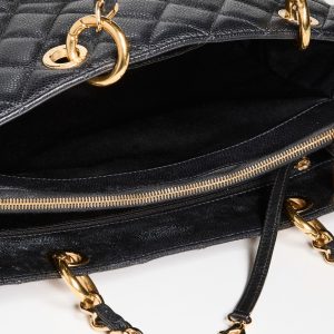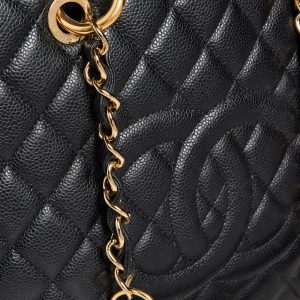 This is an authentic Grand Shopping Tote GST in Black. This stylish tote is crafted of diamond leather in black. The bag features leather threaded polished chain-link shoulder straps with leather shoulder pads. a prominent logo on the front. and a rear flat pocket. The top opens to a partitioned black satin interior with a central zipped compartment. zipper and patch pockets.